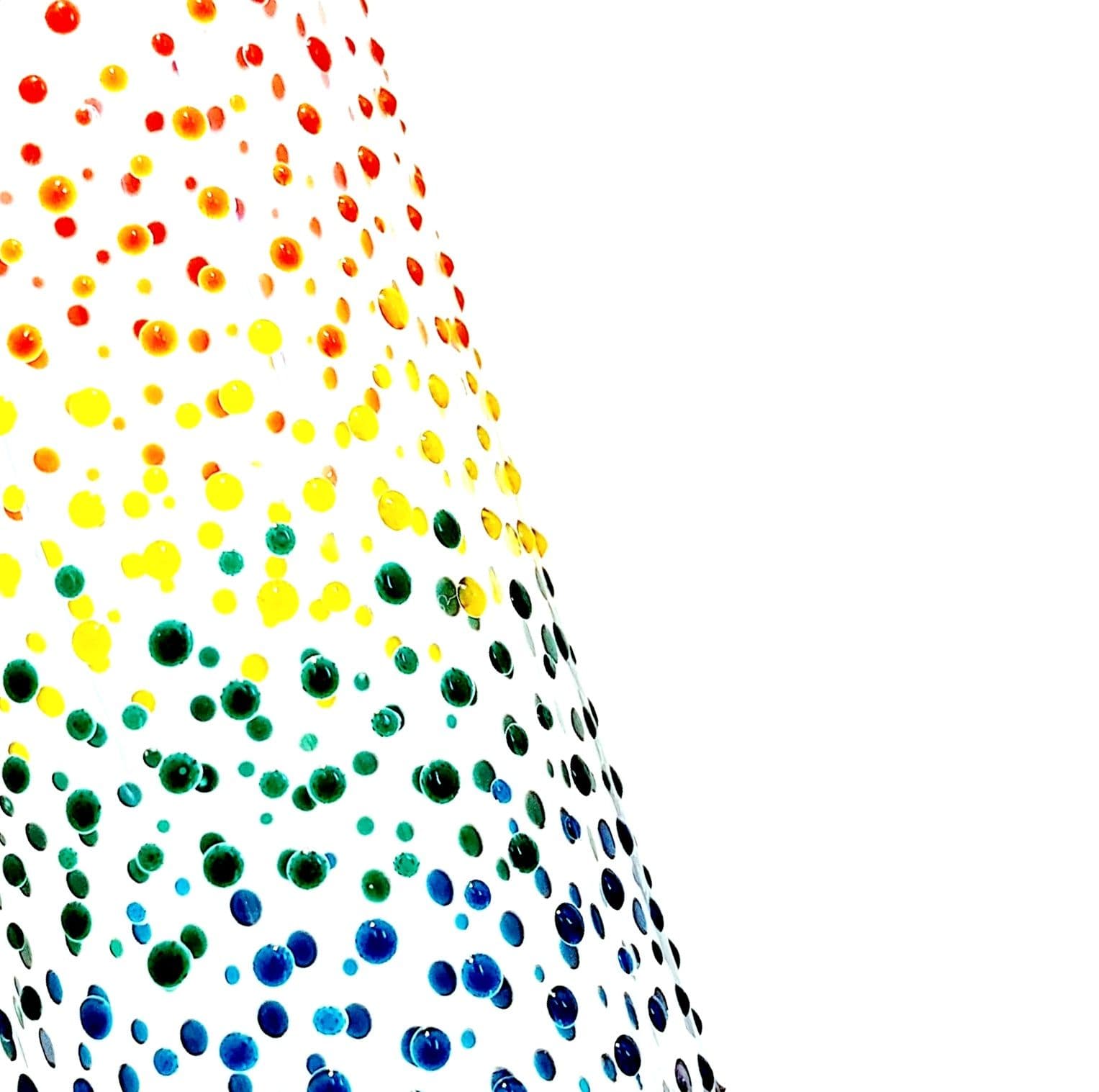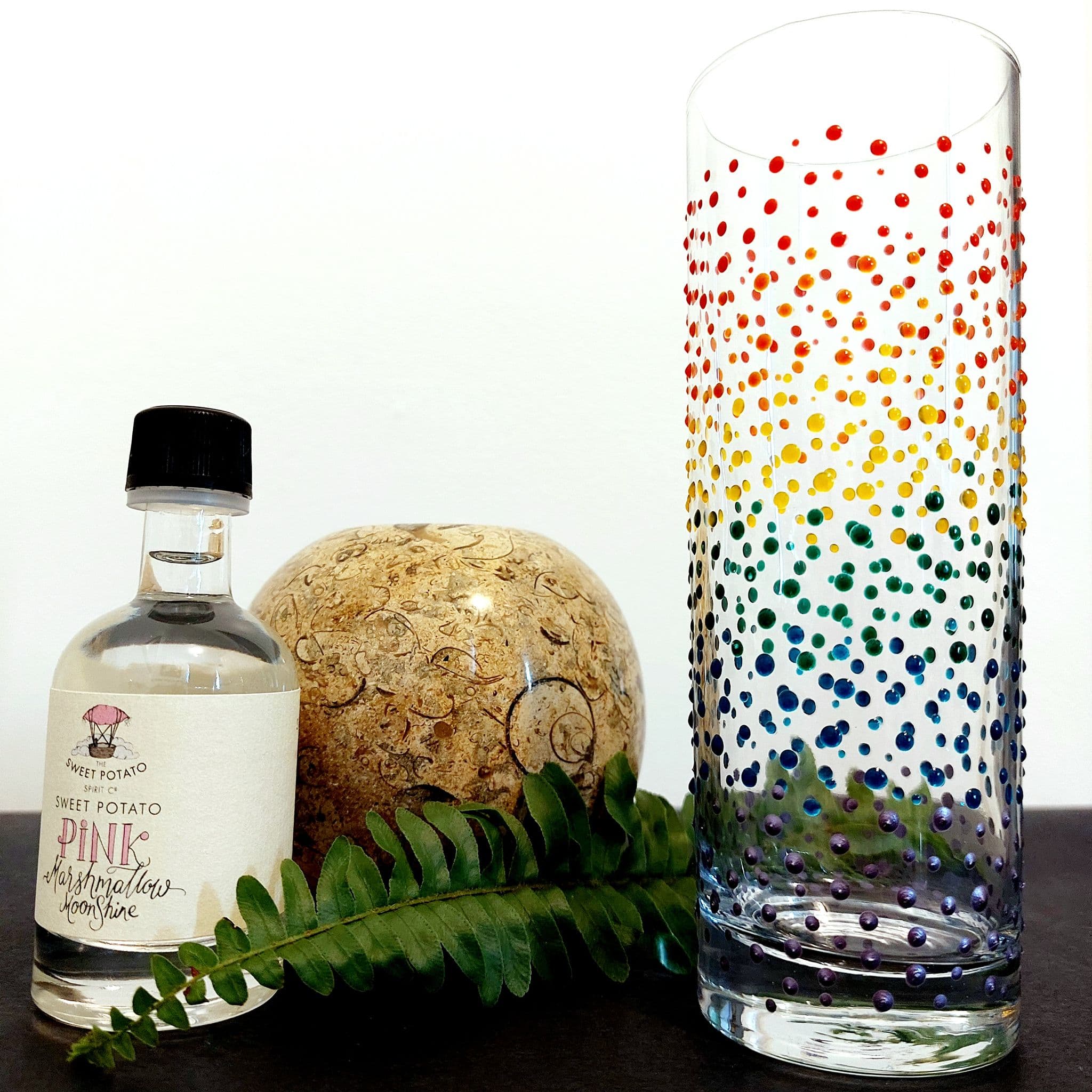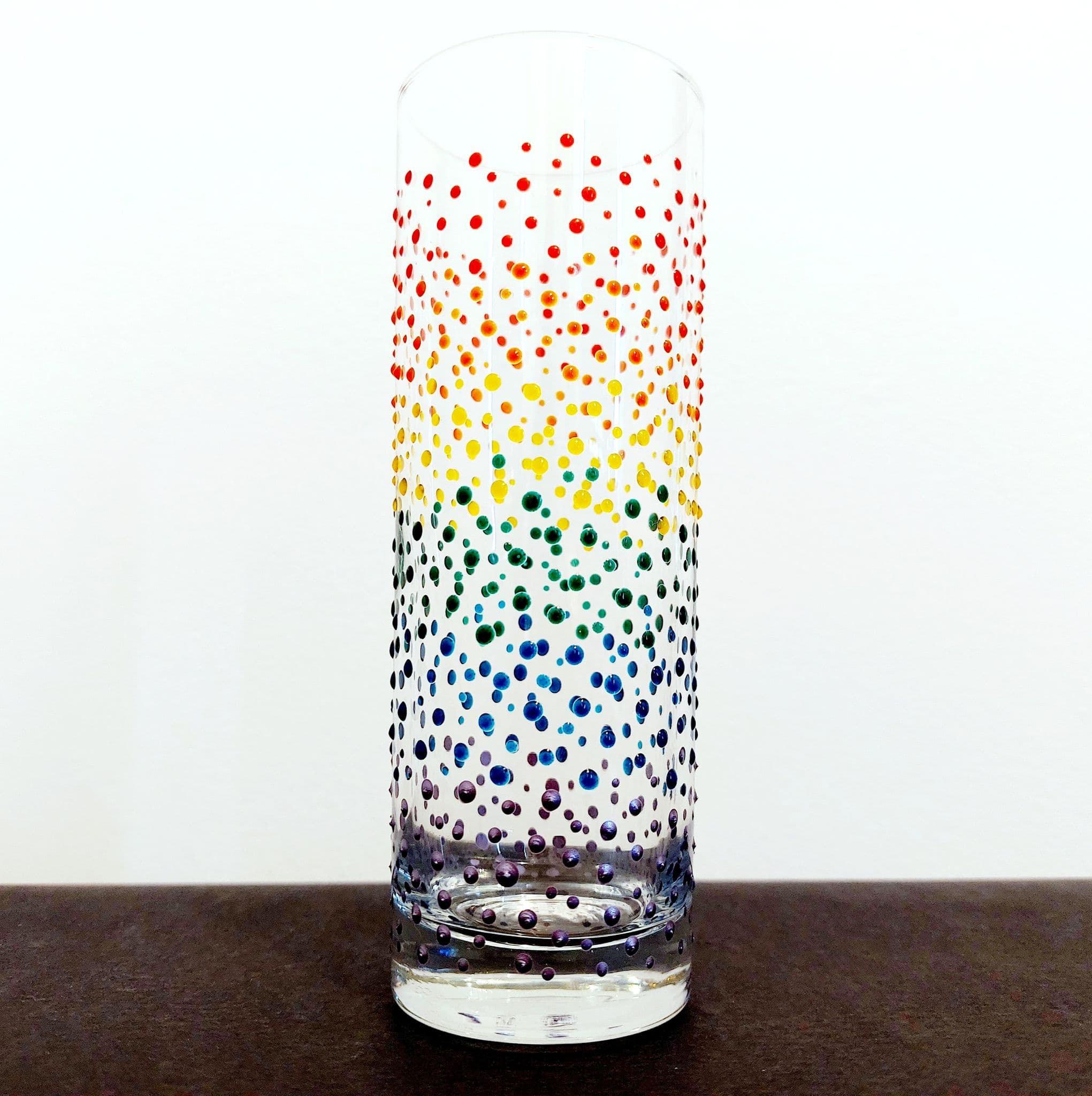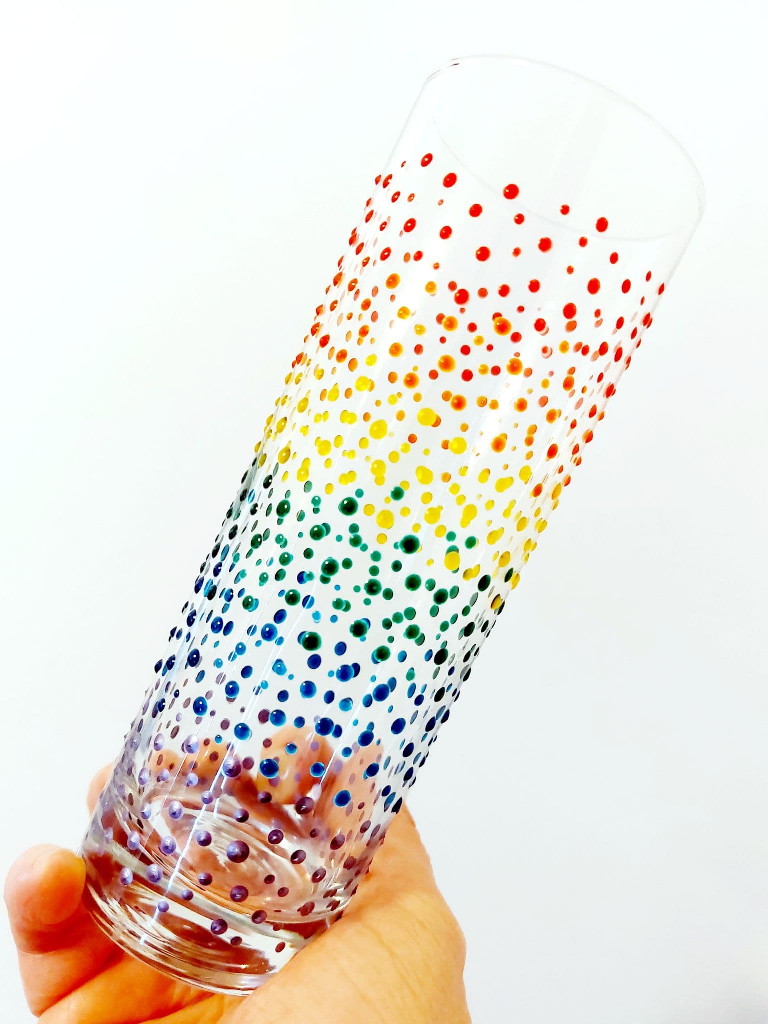 The long tall glass is painted to order with a vibrant multicoloured dot design.
